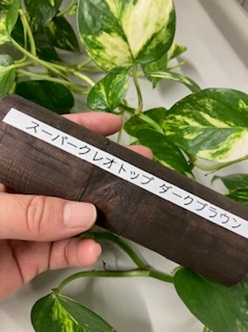 試しに会社の倉庫にあった木片に塗り、分かりやすいように、私が毎日かわいがっている観葉植物(私よりも社歴が長いポトスの鉢植)をバックに写真に撮ってみました。