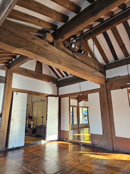 床は板張りで畳はありません。壁と天井は漆喰が塗ってありますが、梁や垂木が現しになっています。