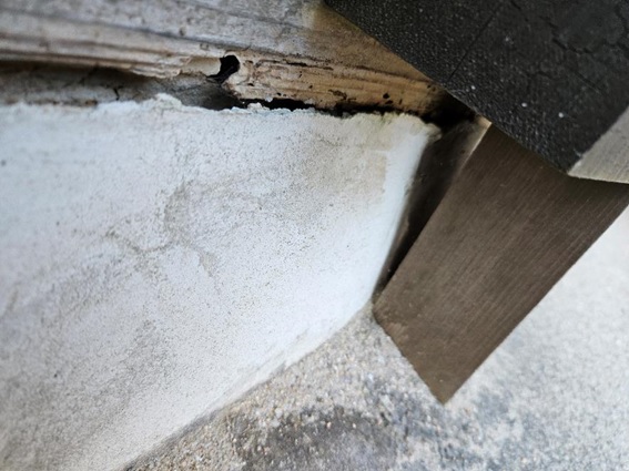 床のシートをはがすと、蟻道が確認されました。結局、屋内外でおびただしい数のシロアリ被害が発見されました。