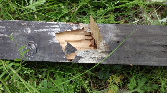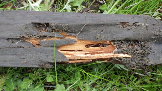 他社製AWを塗った杭は、1本が激しい腐朽とシロアリの食害により、折れてしまいました。