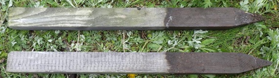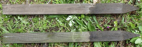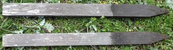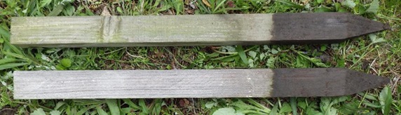 無処理(何も塗っていない杭)は下の杭にシロアリの被害により崩れた部分があります。