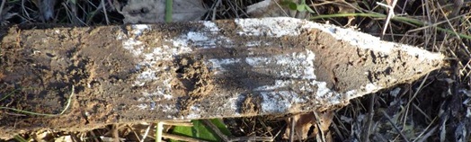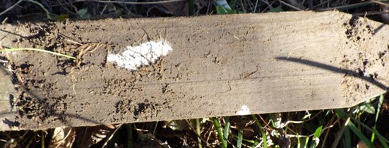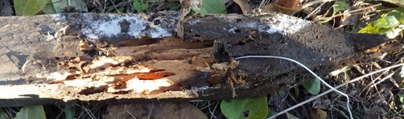 他社製AOを塗布した杭は1本はシロアリの被害のため折れ、もう1本は木材腐朽菌の白い菌糸に覆われています。