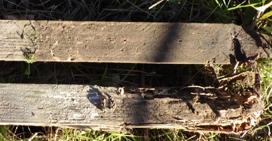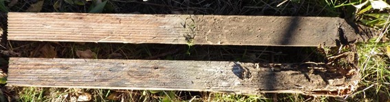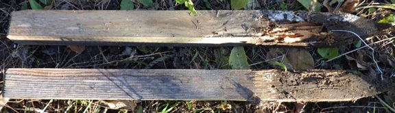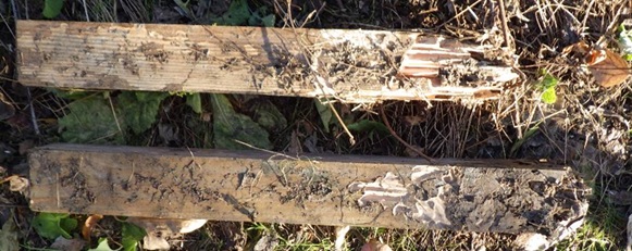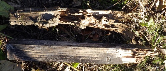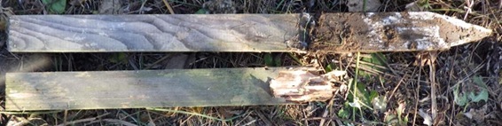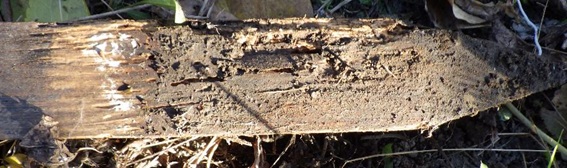 他社製AAを塗布した杭は激しい腐朽とシロアリの被害のため、2本とも折れてしまいました。