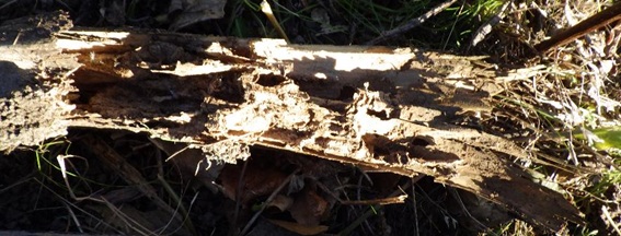 白いのは木材腐朽菌の菌糸です。木材が腐朽菌により分解されています。