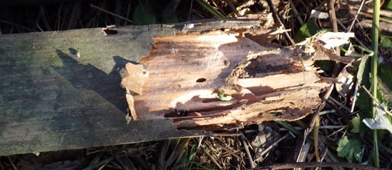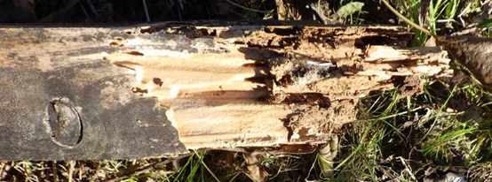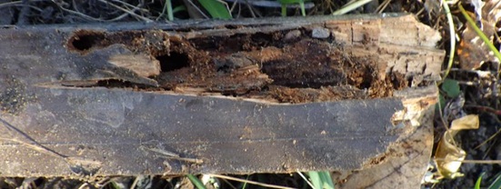 他社製CPを塗布した杭はシロアリに食べられ、穴が開いています。