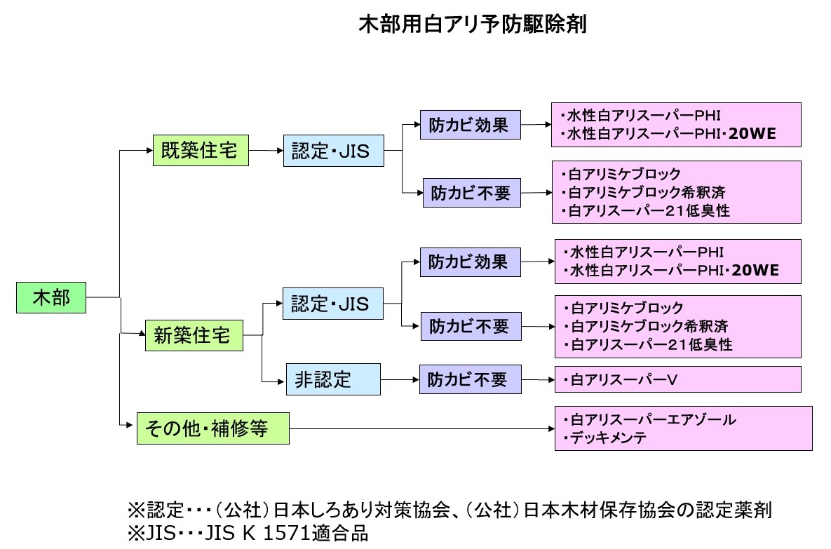 木造住宅や建物のシロアリ予防、駆除、木材防腐用の薬剤で木部処理剤、土壌処理剤、水性、油性、低臭性、粒剤、燻蒸剤など、さまざまな状況に対応できる豊富な品種を取り揃えています。